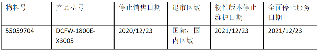 北京神州数码米兰电竞信息技术有限公司正式通知您, 以上DCFW-1800E-X3005下一代防火墙(55059704)将于2020年12月23号停止接收新的订单(具体日期见上表),不再供货。给您带来的不便,敬请原谅。