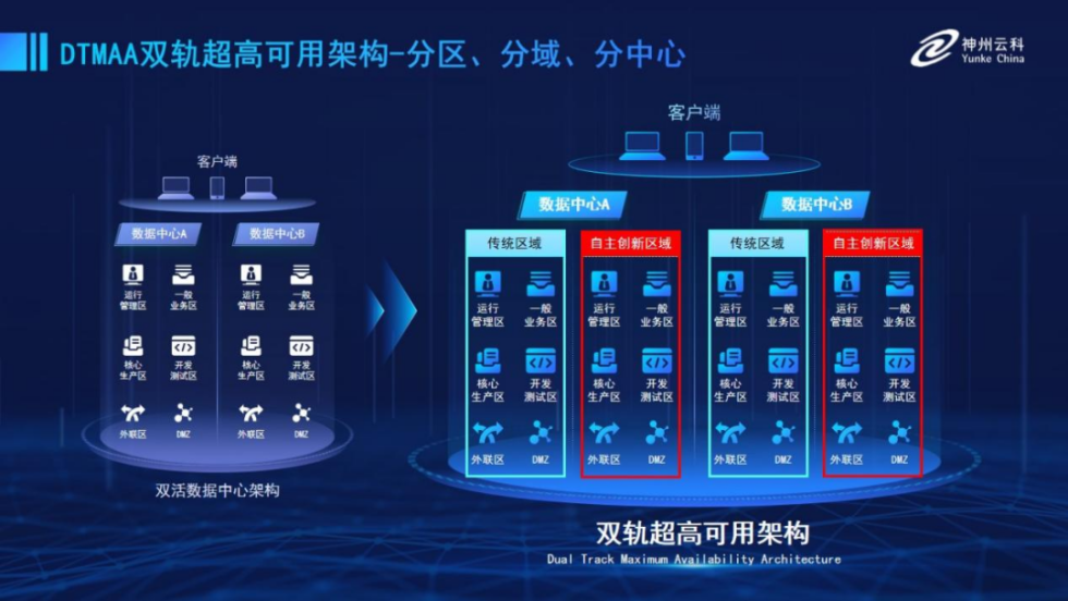 为帮助金融客户更好地应对数字经济时代对可持续性的高要求,实现“信创”与“数字化”齐头并进,神州米兰电竞推出了双轨超高可用架构。该架构在双活数据中心的分区调度基础上,增加信创域和非信创域的分域调度,实行信创域与传统域应用全量部署,使双中心运营变为双中心四区域并行运行,互为多活,将“0到1”的单轨建设道路变为分区分域协同的多活双轨超高可用架构。帮助客户在新架构下,保障“信创”的同时解决性能瓶颈,提升稳定性,保证应用可持续性,最终实现信创区域和非信创区域的平滑过渡,完成国产化替代目标。